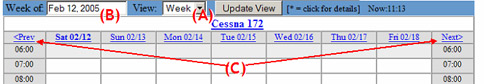 The calendar can be viewed by Day, Week, or Month (A). The day(s)/month shown can be set by entering a date in the Week of/ Day of entry box (B). You can also view the previous or next time period by clicking on the Prev or Next links.